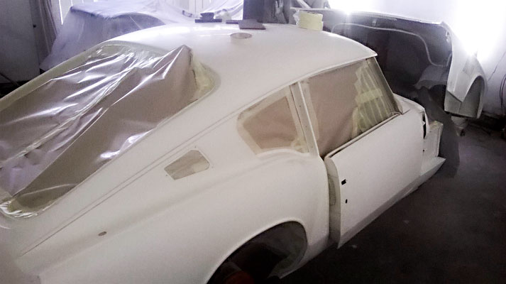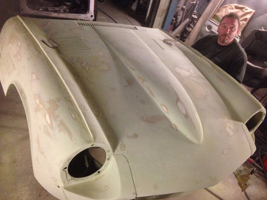Comments from Steve : "Another photographic update for you. We have found quarter of an inch of filler/fiberglass on the near side wing at the top seam of the bonnet. its where the dip was in the upper seam joint. its a bit of an unexpected pain to be honest, but we shall overcome. Up to now, the car has been flattened twice, guide coated, barr coated and flattened again, today it has had more flatting and paint applied, will send you some photos as and when"