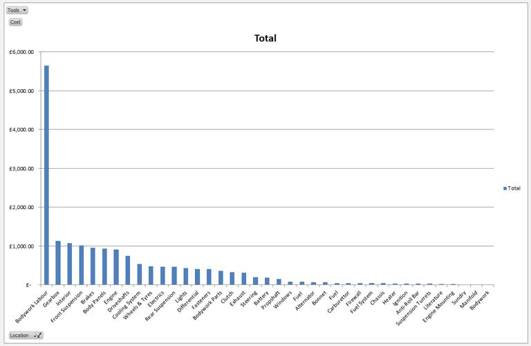 The first thing I did was to start a spreadsheet with every invoice and part listed, with a column of which area of the car was the money spent on. Below is a bar graph from the spreadsheet giving each area in order of magnitude.
