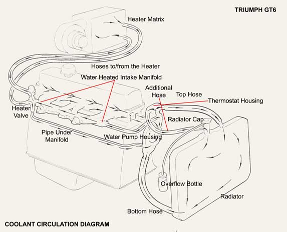 Looking at the diagram above (from Triumph's official Workshop Manual) there are five rubber hoses. The largest are the top and bottom radiator hoses and there is an additional hose from the thermostat housing to the radiator (below the filler) to prevent air locks when filling. The other two hoses run to and from the heater matrix (situated under the dashboard) from the heater valve. A small pipe runs from the radiator cap to an overflow bottle which is attached at the side of the radiator. When the thermostat is closed the water flows from the water pump housing into the water passages in the cylinder head through which it goes into the engine block. Water also flows through the heated inlet manifold. It returns to the water pump through other passages in the cylinder head. When the heater valve is open it circulates through the heater matrix and returns through an additional pipe located under the manifold. When the thermostat opens the water also circulates through the radiator, in at the top hose and out through the bottom hose. A useful description of cooling systems per se can be seen on the CarParts.com website by clicking here.