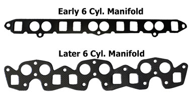 Triumph made various types of cylinder head. They can be identified by two numbers, one actually cast into the cast iron head, and the other stamped (like an engine number). The early Triumph 6 cylinder engines (including the GT6 Mk1) had a completely different cylinder head to later models. It is easily identified by the all the ports being inline, wheras the later "wide" cylinder head did not. This is best illustrated by looking at the manifold gaskets, below: