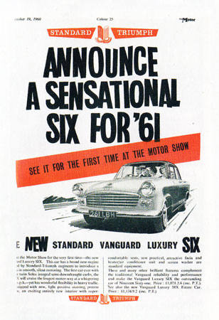 The Standard-Triumph cylinder engine was originally developed for the Standard Vanguard Luxury Six, which came out in 1960, see advert below:
