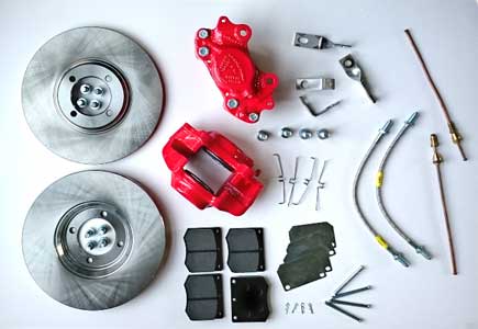 New "performance" Mintex M1144 disc brake pads were fitted (see above). The holes had to be drilled out to 1/4" to take the larger pad pins. These pads have a friction coefficient of just over 0.4 and are designed to work well from cold. Compared to standard brake pads they offer increased fade resistance and better brake modulation. They are also larger than standard, offering a greater contact area. All the front brake components can be seen below, prior to fitting. Apart from the refurbished calipers they include new disks, pads, shims, pins,stainless steel brackets, bolts, Earl aviation quality flexible braided stainless steel and copper brake pipes.