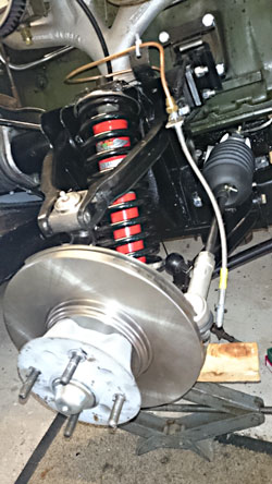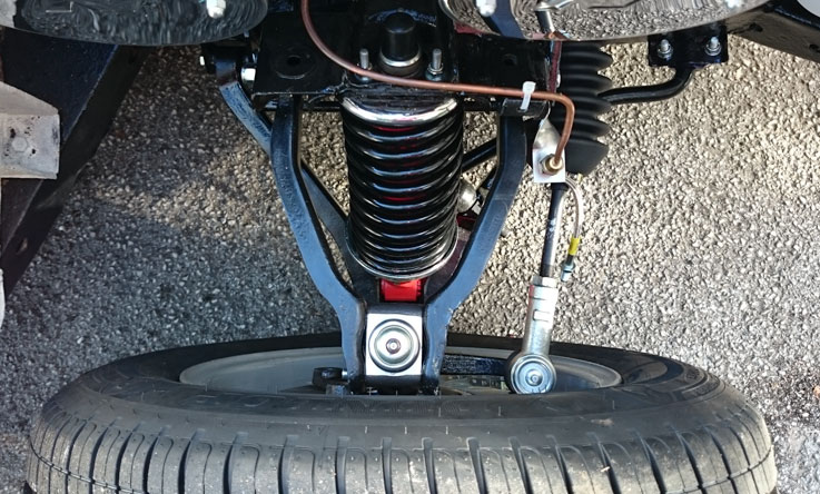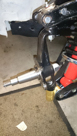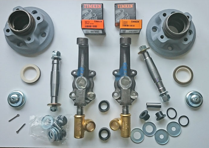 The original wheels were discarded in 1980 (they had already lost their Rostyle hub caps) when I bought some Dunlop 5½J x 13 steel wheels from Demon Tweeks. However for the latest restoration I found some GB alloy wheels in the same size (see Wheels & Tyres). Apparently these need longer studs as they are thicker than steel, so I obtained some longer 3/8 UNF x 47mm wheels studs. A popular upgrade is to also fit thicker 12mm studs but as I also had the special GB wheel nuts which were 3/8" UNF I had to keep to that size. The original wheel hubs were retained, as they were in good condition, but I used new stub axles and good quality Timken bearings. These were mated to new vertical links, see below: