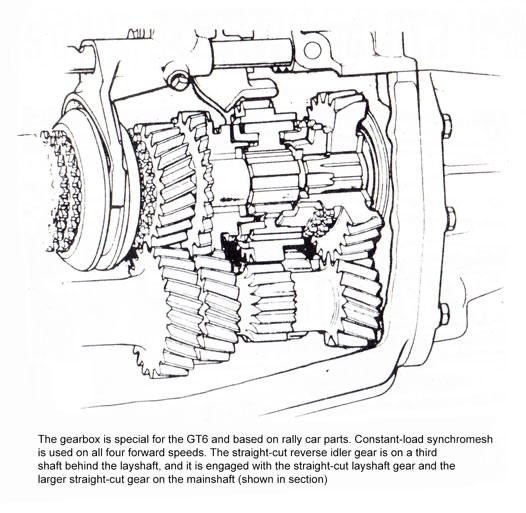The GT6 all-synchromesh gearbox was a new design developed from that of the Vitesse, making use of several well-proved Vitesse components. The aluminium alloy bellhousing is a separate casing to the cast iron gearbox casing, a new design developed to accommodate the re-arranged gears and synchromesh mechanism on bottom gear. Attached to the rear is the extension which houses the tail end of the mainshaft. On the Spitfire and Vitesse gearboxes, first gear and reverse are engaged by sliding the non-synchronized mainshaft gear into mesh with the appropriate train. On the GT6 the first gear is in constant mesh, but free to rotate on the mainshaft to which it is connected by the dog-teeth of the synchromesh mechanism. Reverse is engaged by sliding the reverse idler idler into line with the reverse gears on the layshaft and mainshaft; the mainshaft gear is part of the synchromesh assembly for 1st and 2nd gears. Synchromesh is of the constant-load type common to all Triumph models except the 1300; it should inherit the robust effectiveness of the previous designs. Ratios are very close, with bottom gear high at 8.66 to 1. The car is reputed to reach 46 mph in bottom, 68 mph in 2nd, and no less than 96 mph in third. This gearbox was first developed on prototype competition Spitfires during 1964 and 1965.