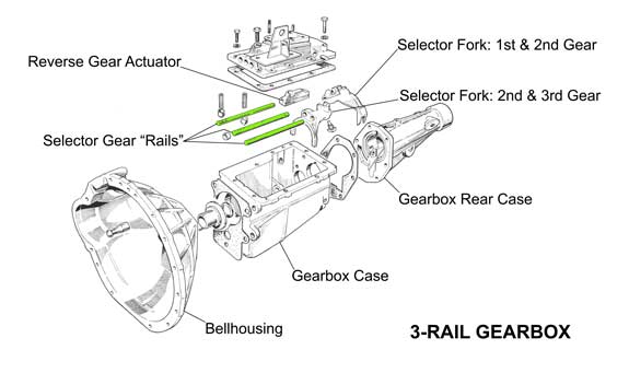 Which is best, single or 3-rail? The 3-rail tends to wear more at the gear linkage and also the main shaft front tip bearing is only ½” (around 13mm). The single rail has a more robust gear linkage and the main shaft front tip bearing is bigger at 18mm, but otherwise the parts inside are very similar. Many parts are interchangeable; it is possible to build a more robust 3-rail gearbox with an 18mm tipped main shaft.
