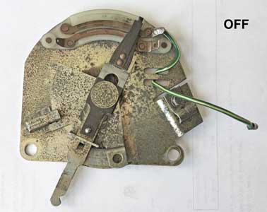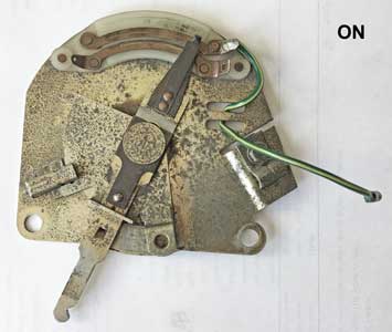 The position of the lever controls the direction of the flow by a short cable (not connected, see below) to the heater matrix flap.  The curved contacts at the top ensure that contact is made irrespective of the position of the lever - at present in the "CAR" position.