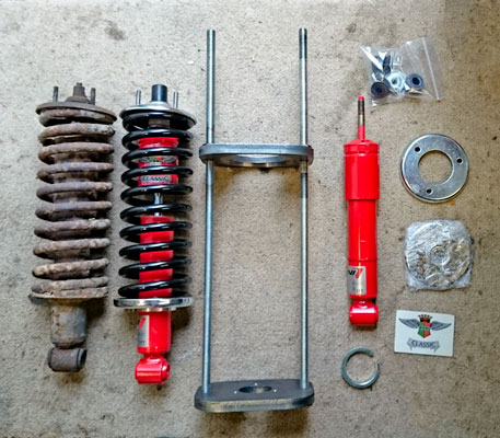 The spring and its fittings were as can be seen on the left of the picture below, so I chose the replacement route. The spring and shock absorber were probably tired in any case, and replacements are readily available. In the centre is the spring compressor I used (this type is the best) and the new fittings can be seen on the right.