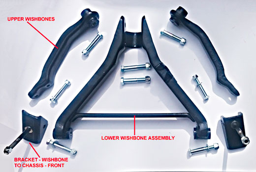 The front suspension is connected to a turret or 'tower' which is itself bolted to the front of the chassis (see Restoration - Chassis). My turrets were very rusty so I bought a couple from ebay in much better shape, although they still needed a good sand and a coat of paint. The main components of the front suspension are the upper and lower wishbones, the spring/shock absorber assembly, the front hub and the anti-roll bar.